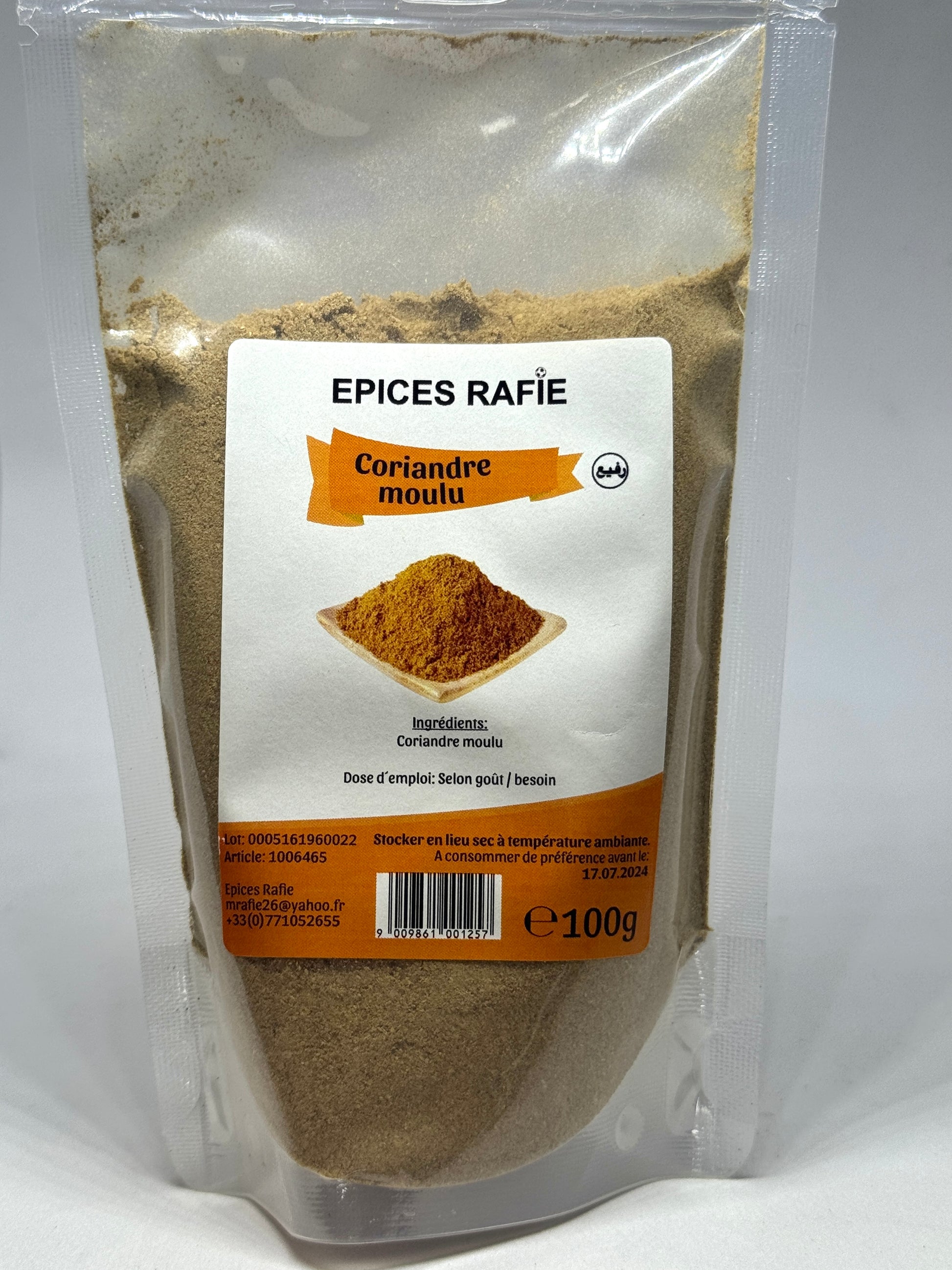 Description : La coriandre moulue est une épice obtenue en broyant les graines séchées de la plante de coriandre, également connue sous le nom scientifique Coriandrum sativum. La poudre obtenue est fine et de couleur brun clair à brun foncé. Elle a un arôme caractéristique, légèrement citronné et sucré, avec des notes épicées et herbacées.