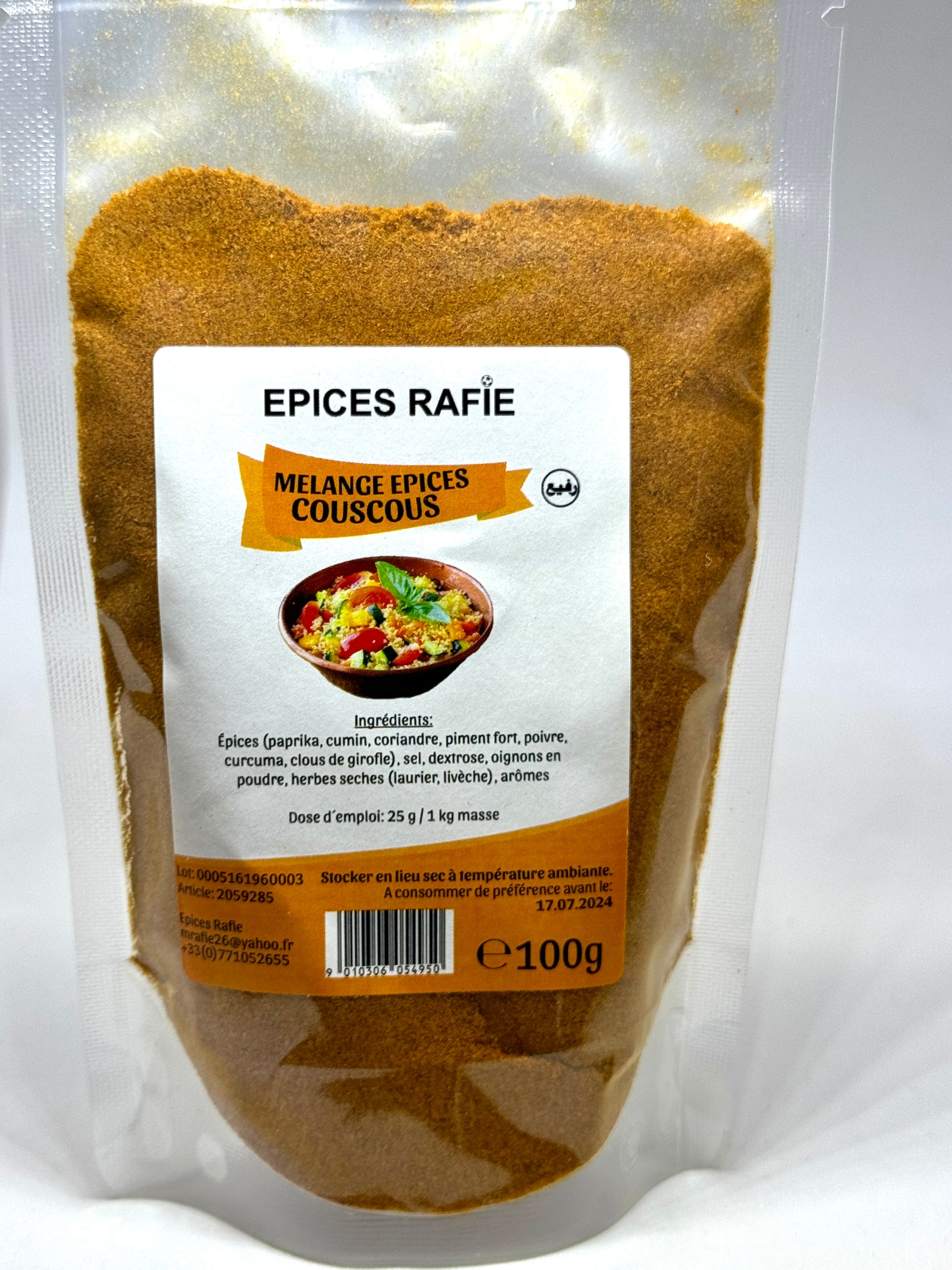 Description : Les épices pour couscous sont généralement un mélange d'épices qui varie selon les préférences personnelles et les recettes spécifiques. Les ingrédients courants de ce mélange peuvent inclure le cumin, la coriandre, le curcuma, le gingembre, le paprika, le poivre, la cannelle, le clou de girofle, le piment de Cayenne et d'autres épices selon les variations régionales et les recettes individuelles.