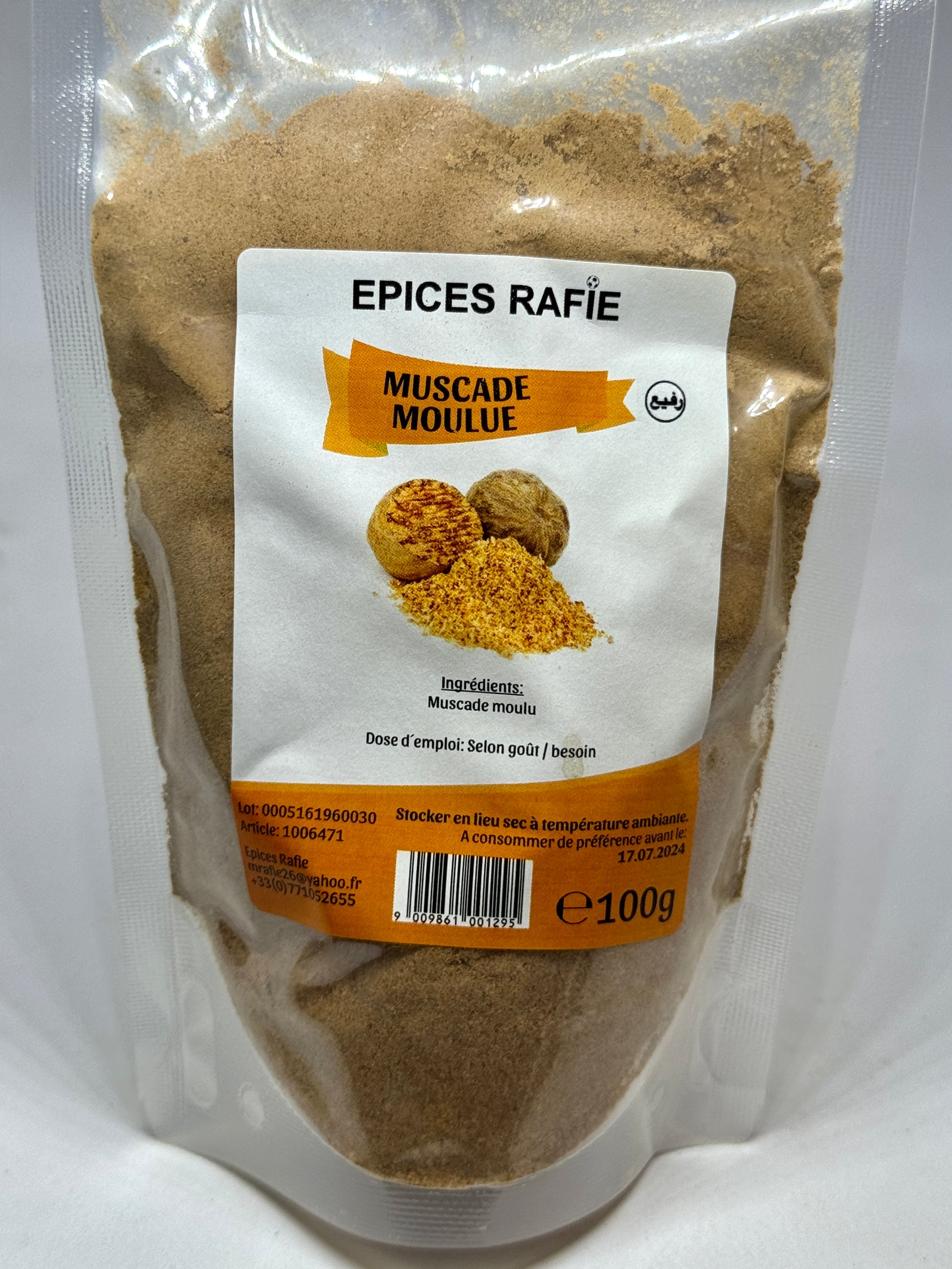 Description : La noix de muscade moulue est une poudre fine et parfumée obtenue en moulant la graine séchée du fruit du muscadier. Elle a une couleur brun clair à brun foncé et une saveur chaude, aromatique et légèrement sucrée. La muscade moulue est souvent utilisée en cuisine pour sa saveur distincte et son arôme intense.