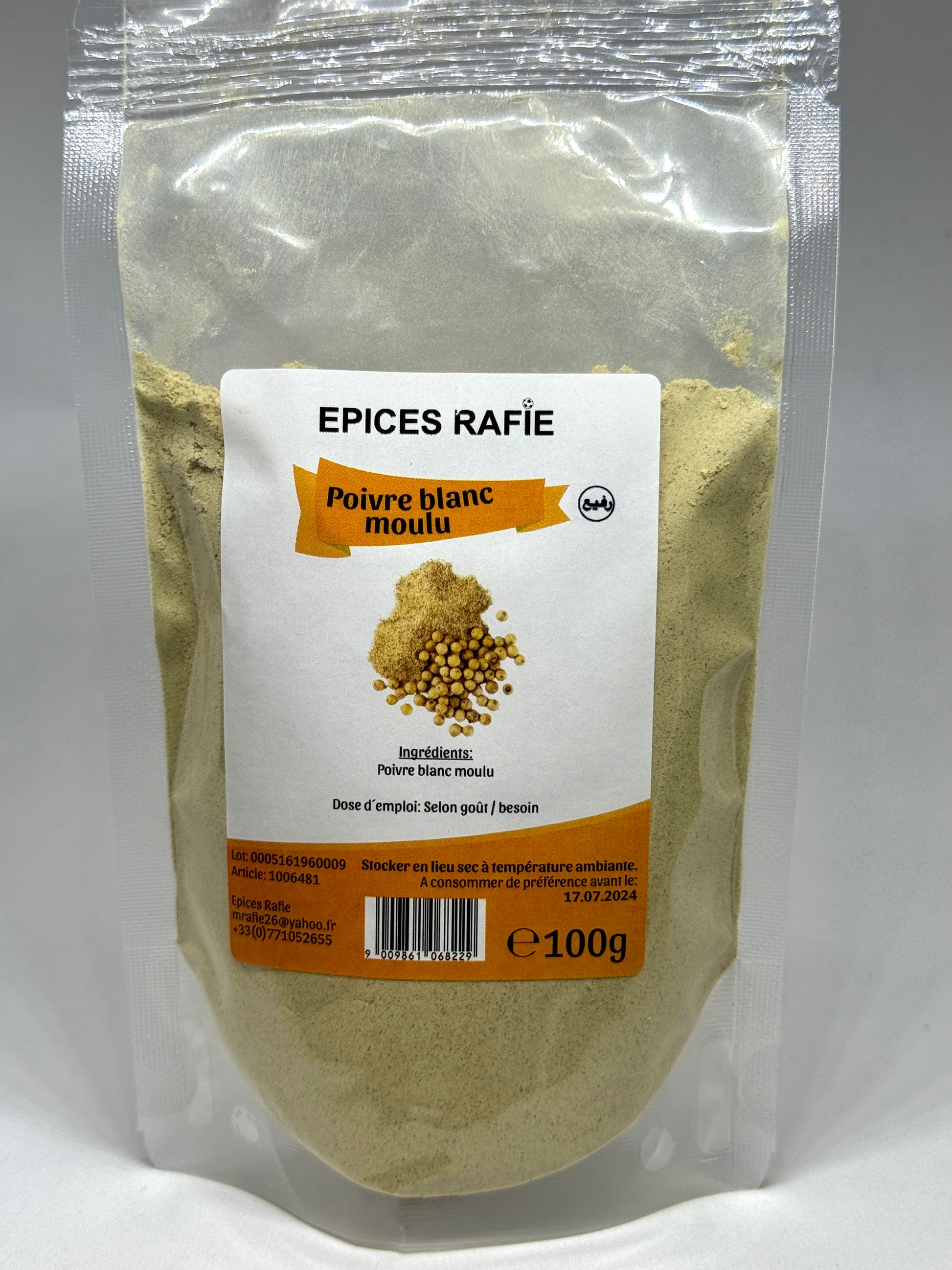 Description : Le poivre blanc moulu est une poudre fine de couleur claire à beige, obtenue en moulant les baies de poivre blanc après qu'elles ont été trempées et leur enveloppe externe retirée. Il a un arôme distinctif et une saveur piquante et légèrement terreuse.