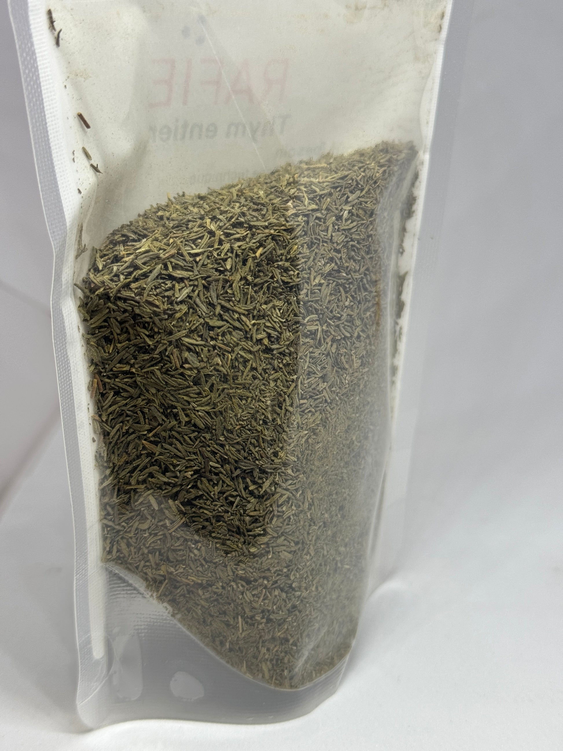 Utilisation : Le thym est une herbe polyvalente largement utilisée en cuisine pour aromatiser une variété de plats. Il est souvent utilisé frais ou séché dans les soupes, les ragoûts, les sauces, les marinades, les plats de viande, de poisson et de légumes. Il ajoute une saveur subtile mais distincte aux plats et est également utilisé comme ingrédient principal dans des mélanges d'herbes comme les herbes de Provence. En dehors de la cuisine, le thym est également utilisé pour faire des infusions et des tisanes, ainsi que dans la fabrication de produits cosmétiques et de soins de la peau pour ses propriétés antiseptiques et antibactériennes.